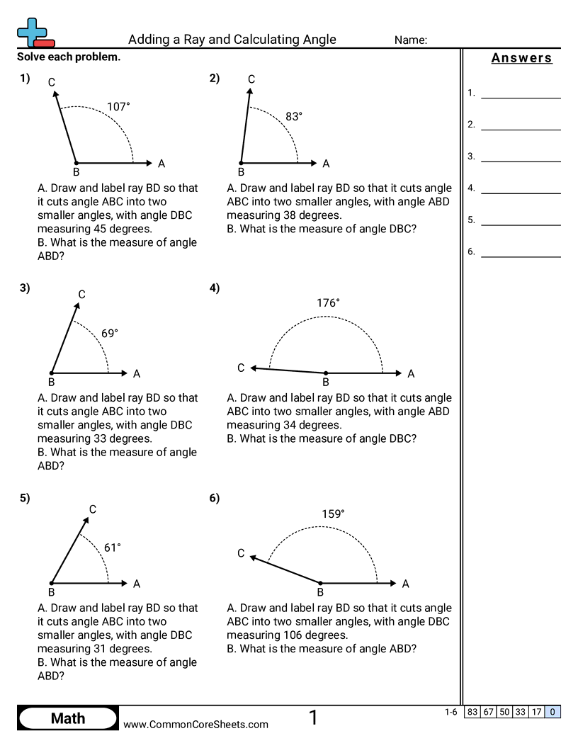 Each worksheet has 6 problems using a protractor to draw a ray and then determining the missing angle.