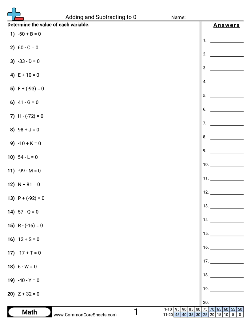Adding and Subtracting to 0 Worksheet Download