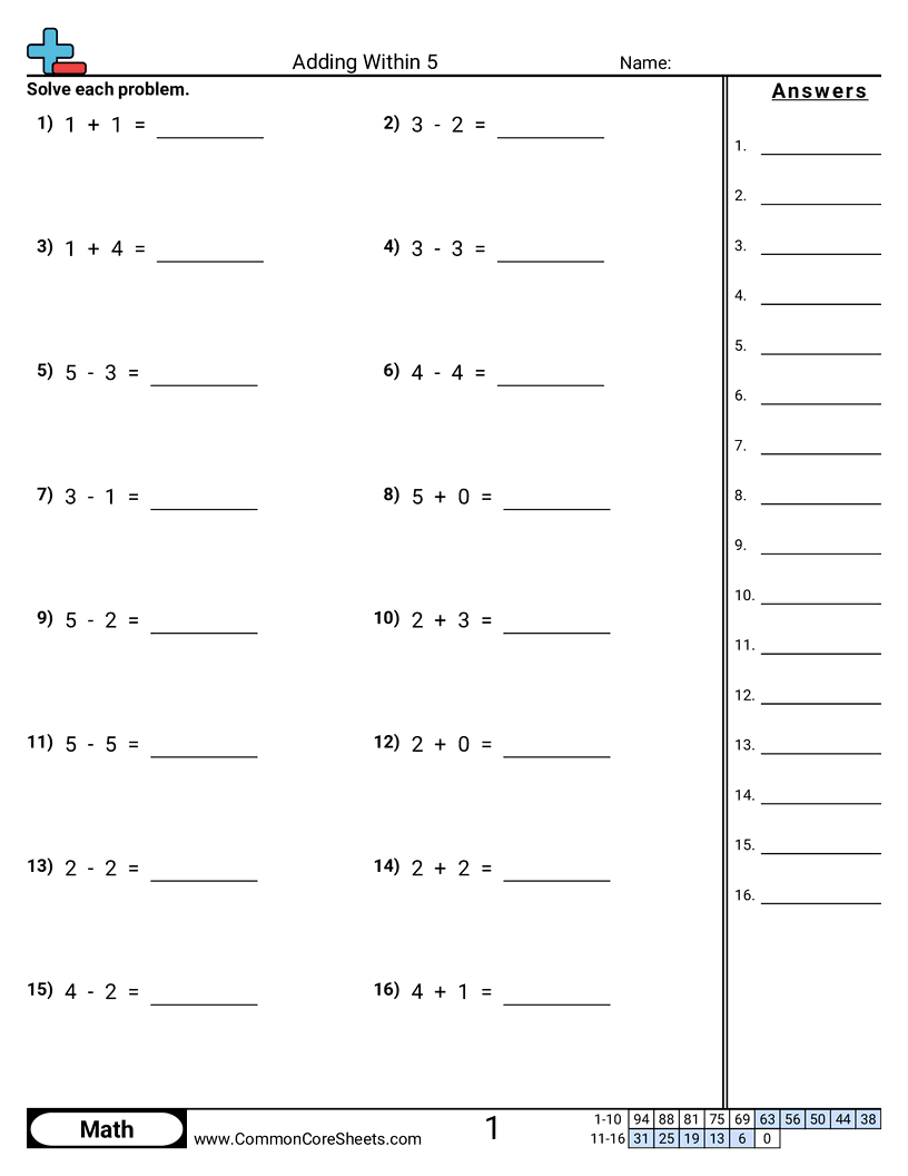 Each worksheet has 16 problems adding within 5.
