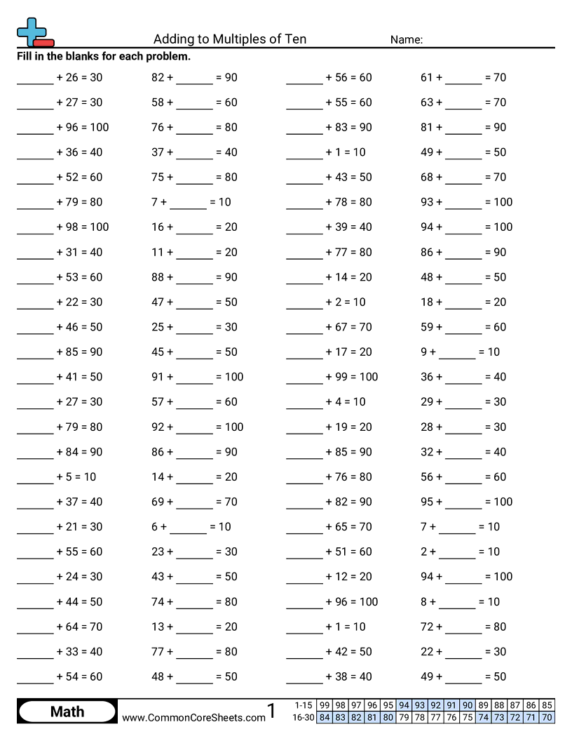 Each worksheet has 100 problems identifying what must be added to equal a multiple of 10.