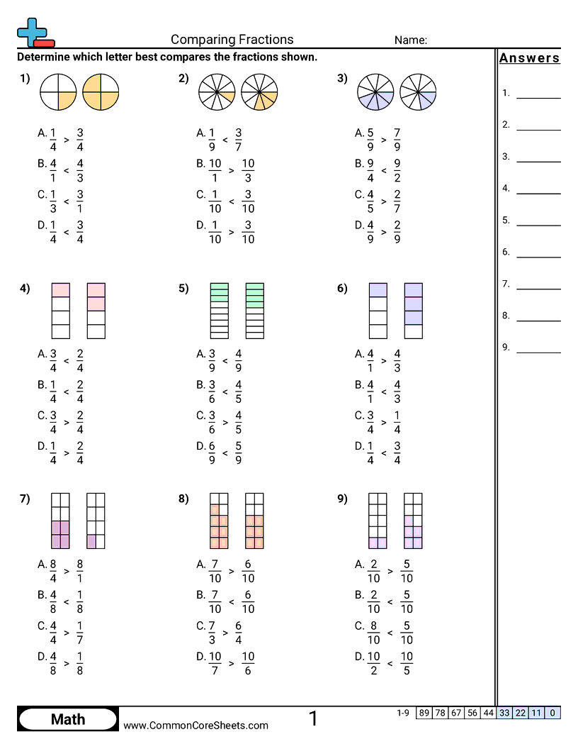 Each worksheet has 9 multiple choice problems comparing two fractions.