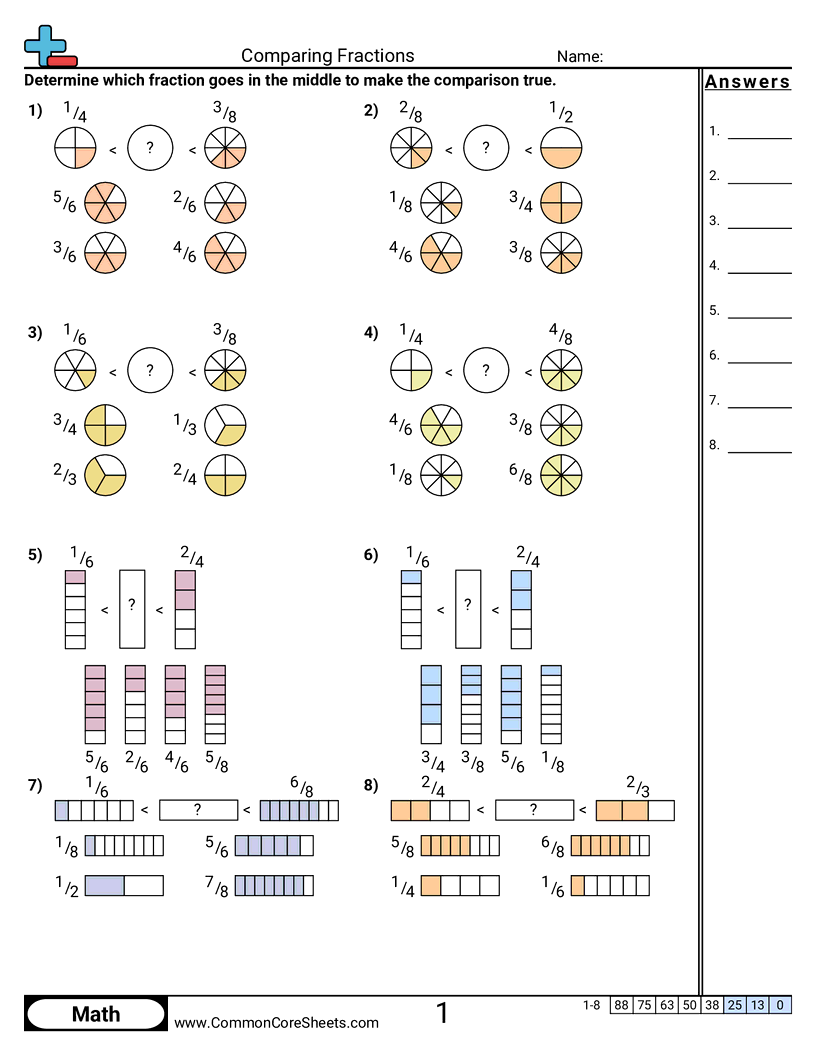 Each worksheet has 10 problems comparing determining the missing fraction in a comparison sentence.