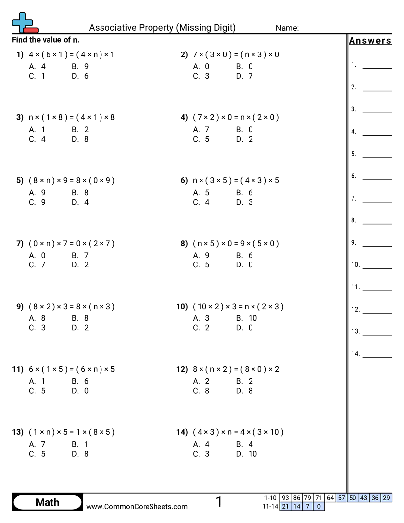 Each worksheet has 14 problems determining the which digit is missing from an associative property problem.
