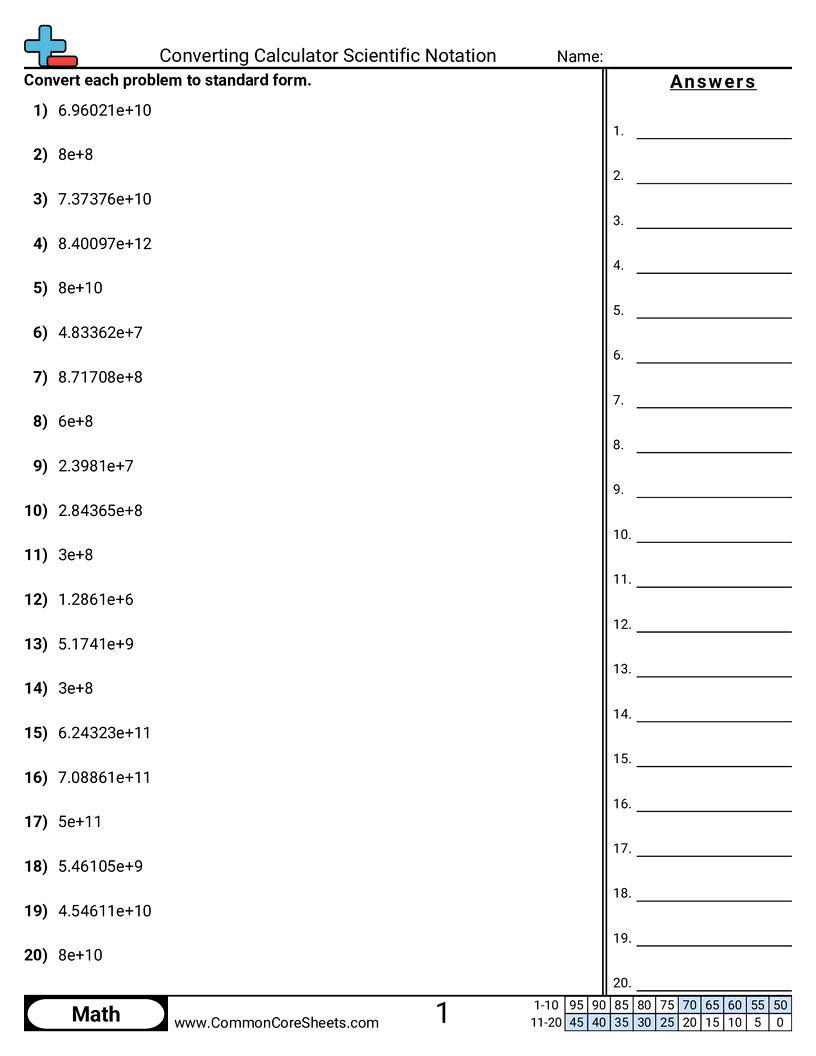 Each worksheet has 20 problems converting from a calculator scientific notation to standard form.