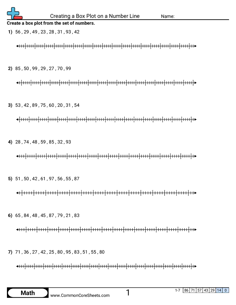 Each worksheet has 7 problems creating a box plot from a set of numbers.