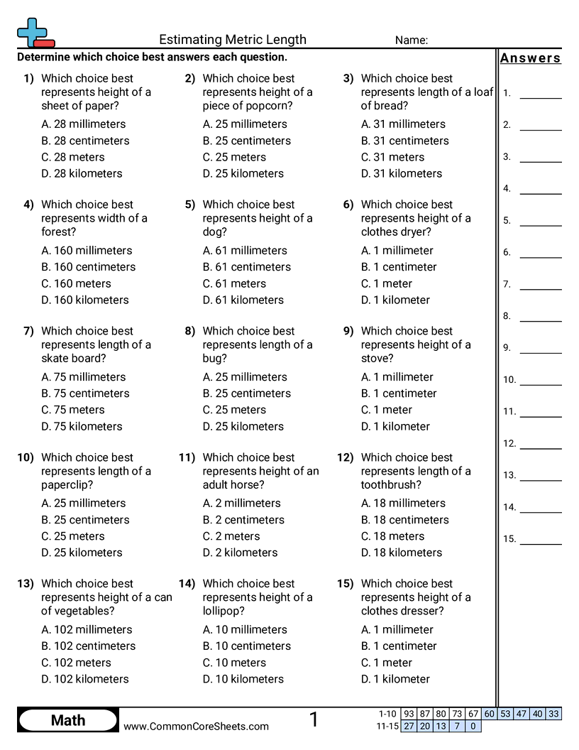 Each worksheet has 15 multiple choice problems determining the measurement of different items.