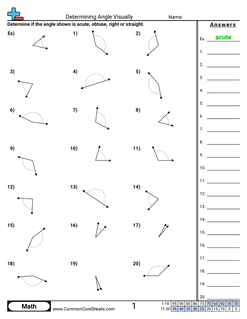 Each worksheet has 20 problems determining if an angle is acute, obtuse, straight or right.
