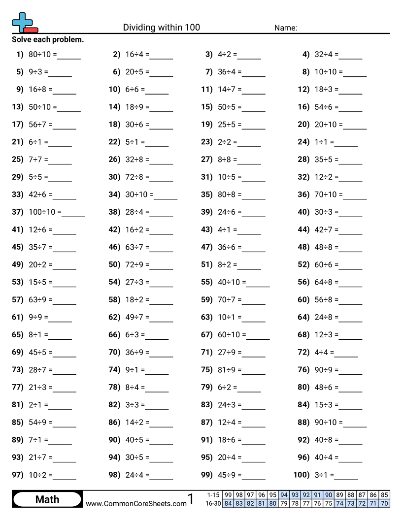 Each worksheet has 100 problems dividing from 10 ÷ 10 to 1 ÷ 1.