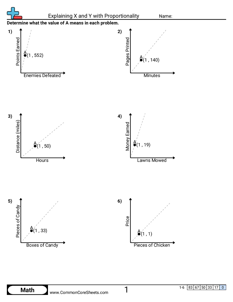 Each worksheet has 6 problems determining the significance of x and y in relation to proportionality.