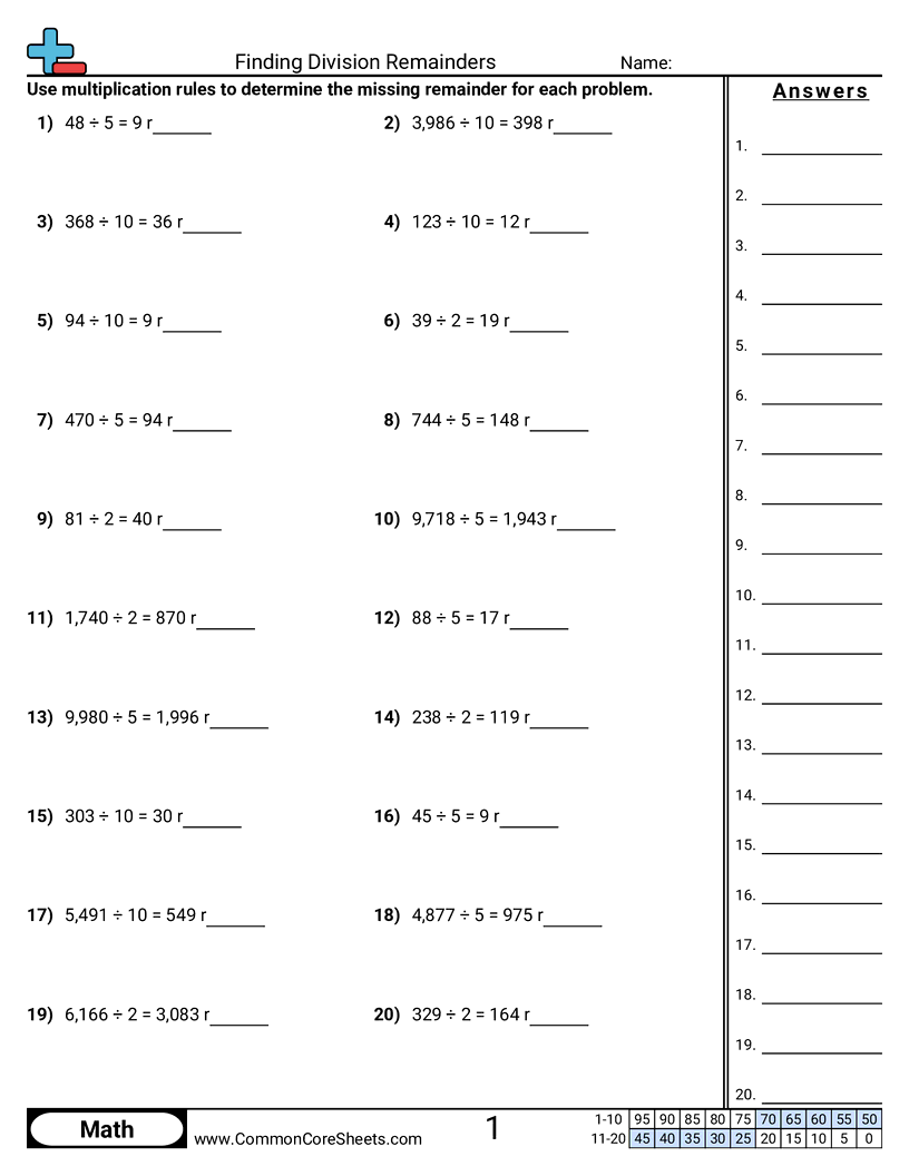 Each worksheet has 20 problems finding division remainders with 2, 5 and 10.