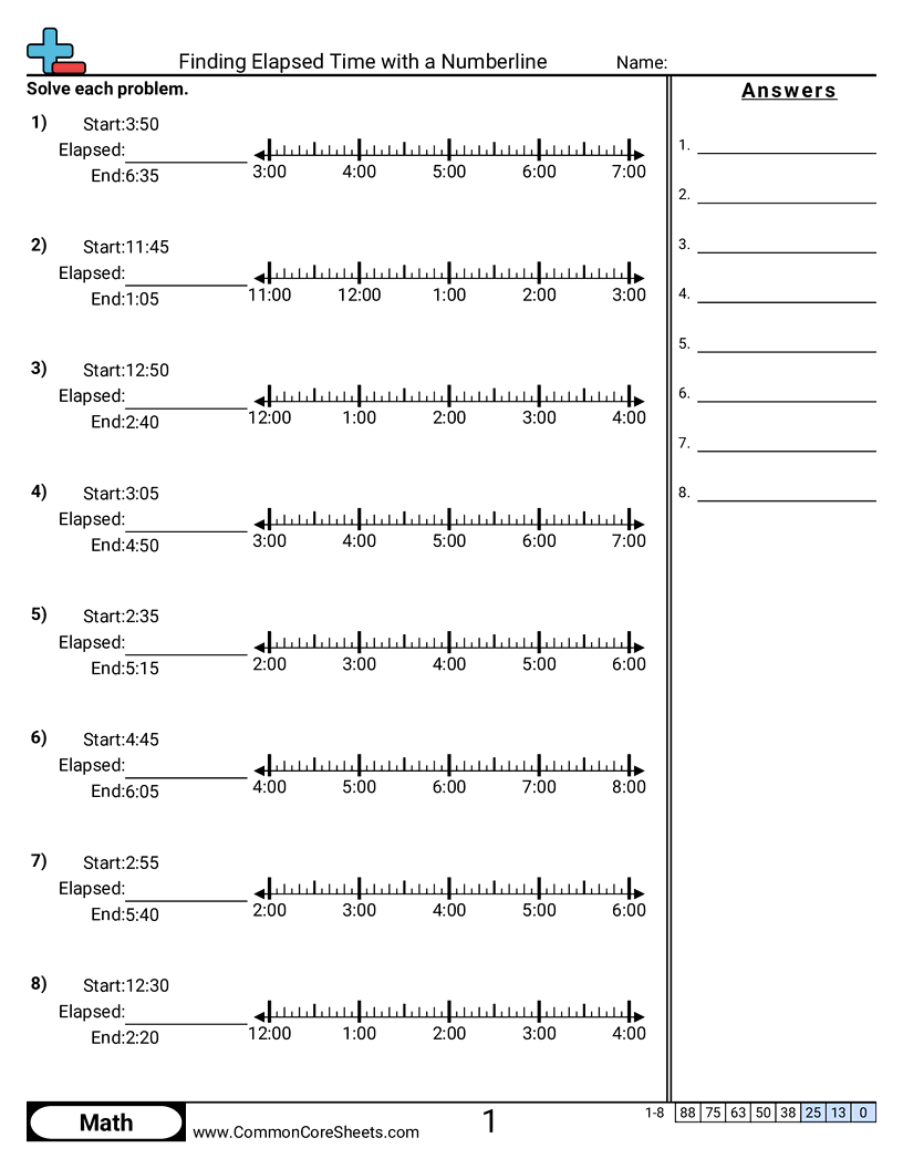 Each worksheet has 8 problems finding the time elapsed with a numberline.