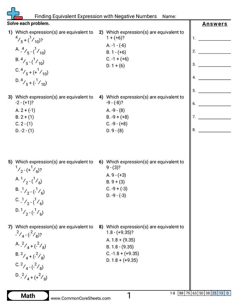 Finding Equivalent Expression with Negative Numbers Worksheet Download