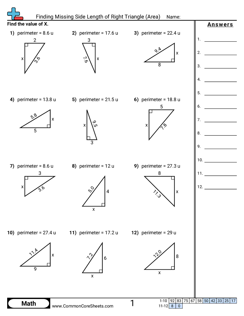 Finding Missing Side Length of Right Triangle (Area) Worksheet Download