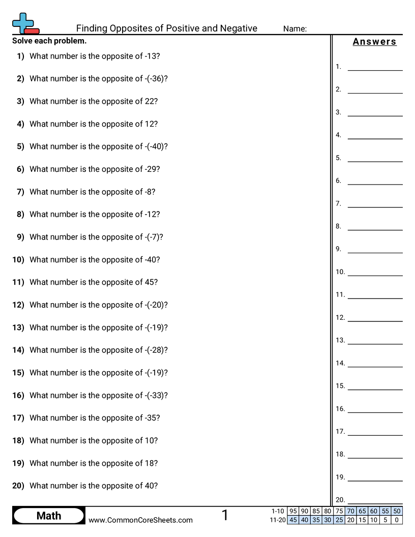 Each worksheet has 20 problems finding the opposite of a positive or negative number.