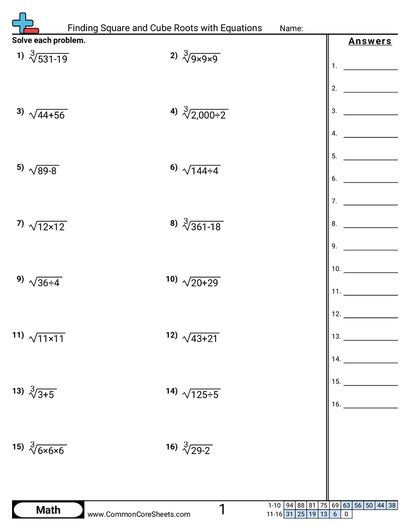 Each worksheet has 16 problems finding the square and cube root of basic equations.
