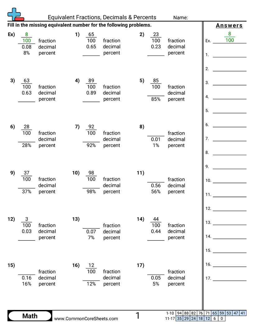 Equivalent Fractions, Decimals & Percents Worksheet Download