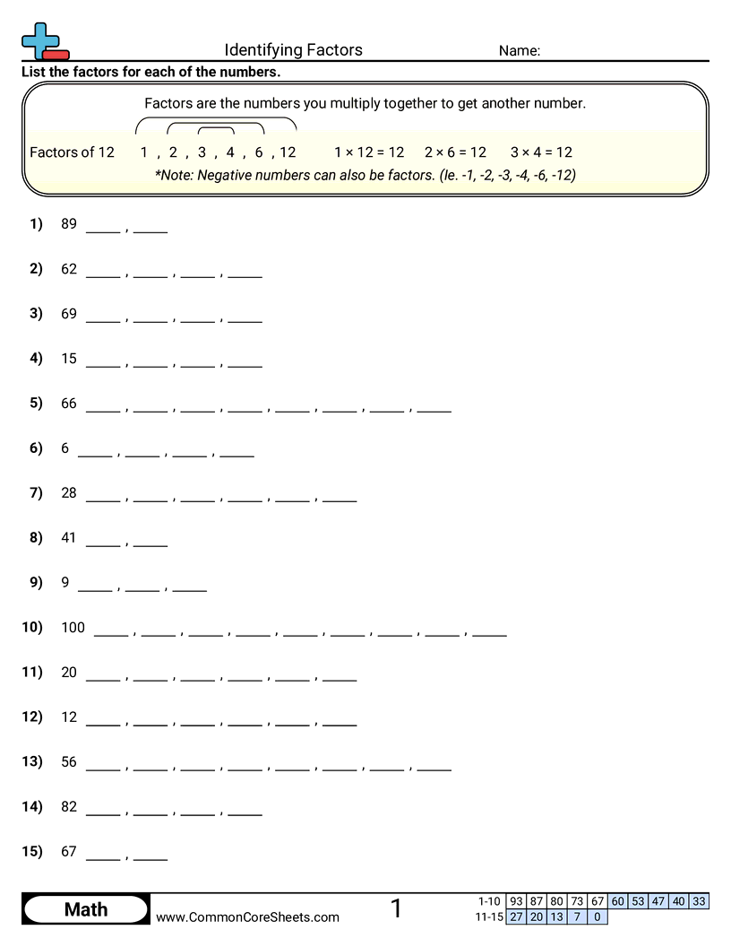 Each worksheet has 15 problems identifying the factors of a number. Blanks are provided for the amount of factors.