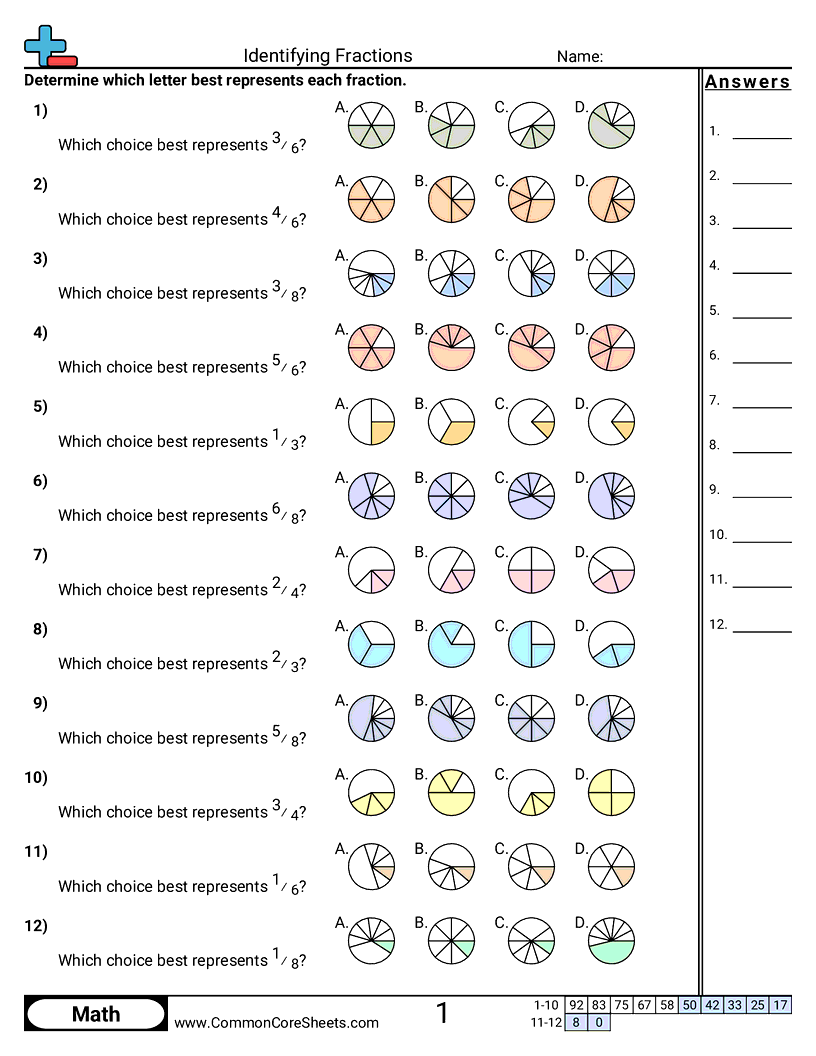 Each worksheet has 12 problems identifying which image best represents the fraction listed.
