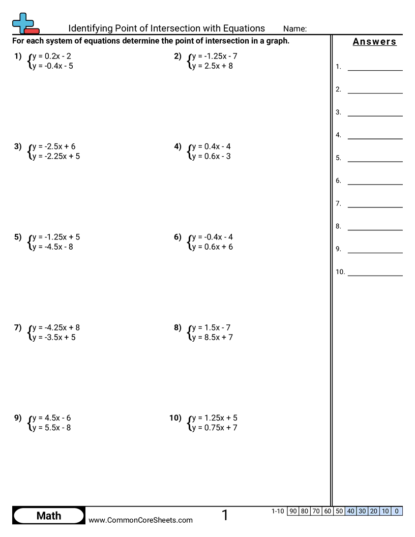 Each worksheet has 10 problems identifying the intersection of two equations.