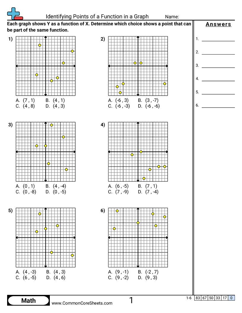 Each worksheet has 6 problems identifying a point that can also be part of the same function on a graph.
