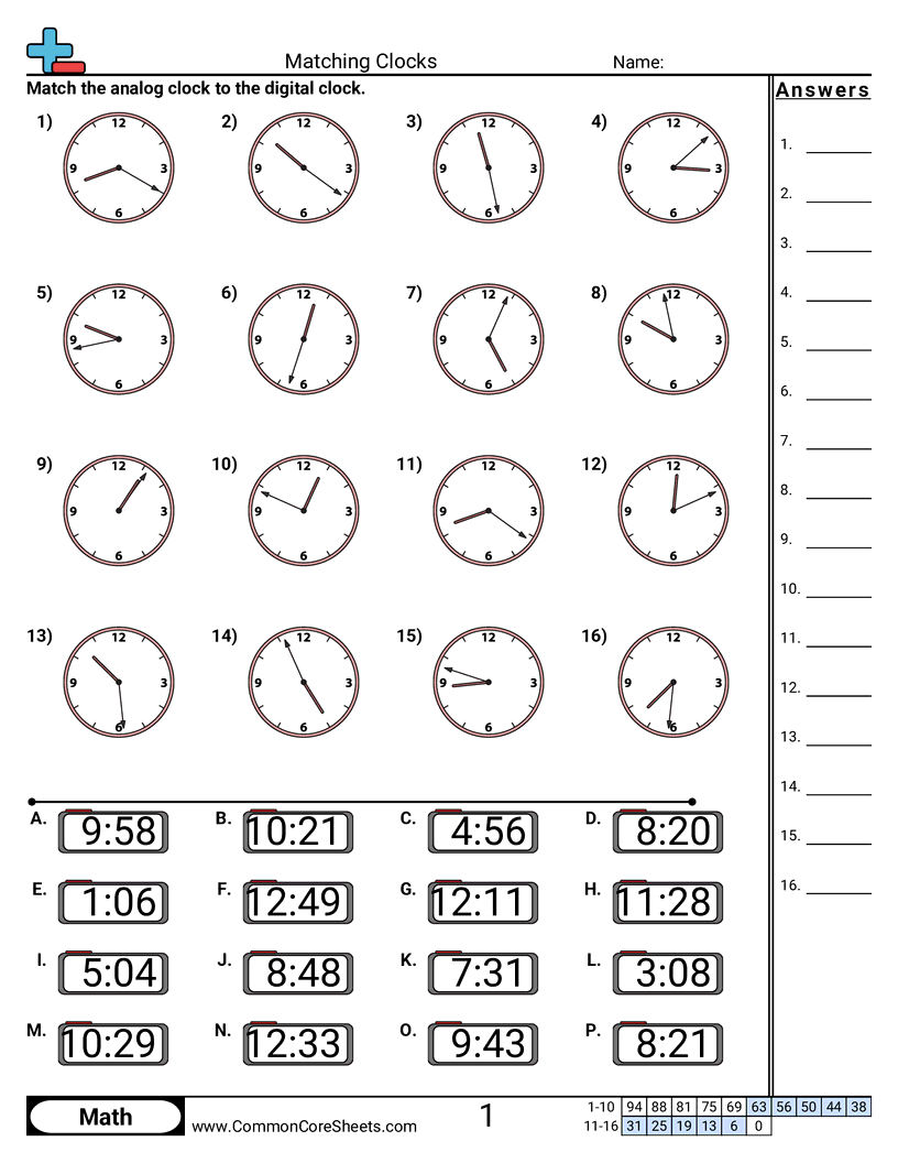 Each worksheet has 16 problems matching an analog clock to its digital equivalent.