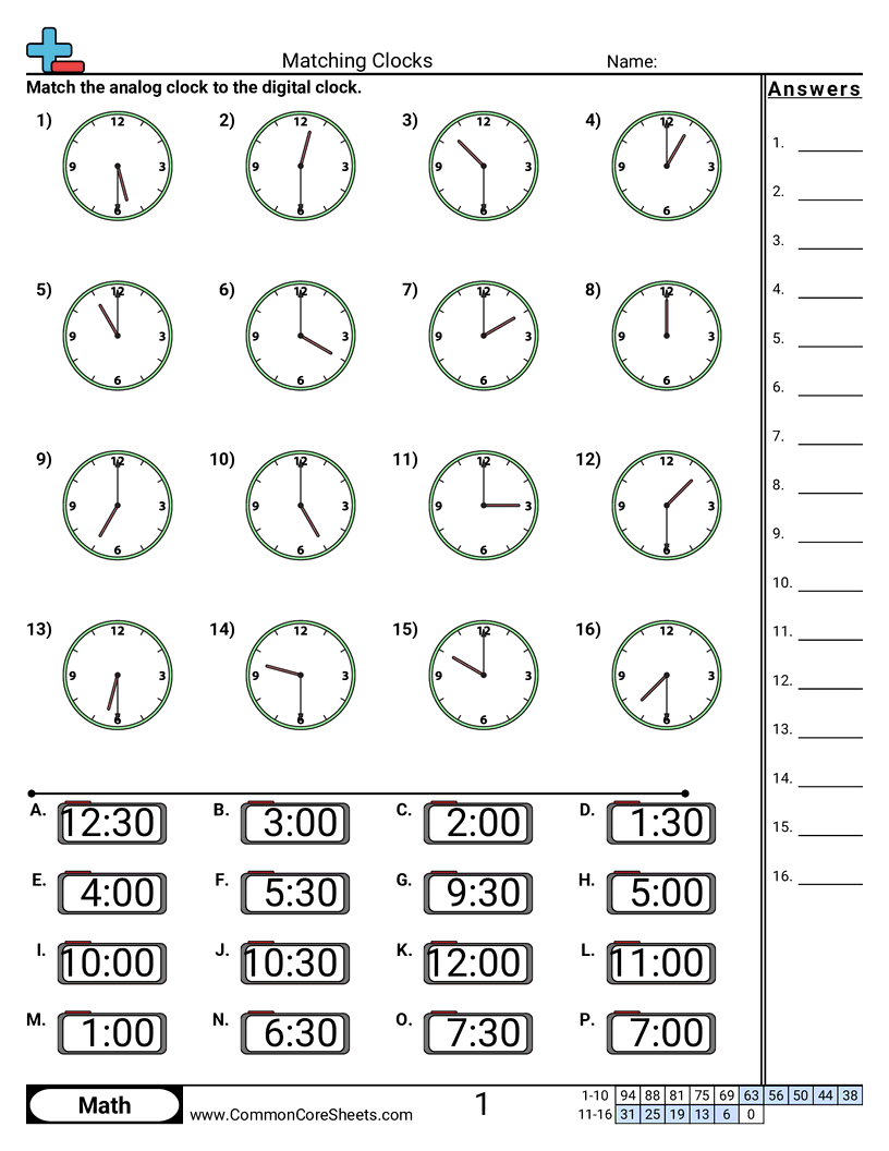 Each worksheet has 16 problems matching an analog clock to its digital equivalent.
