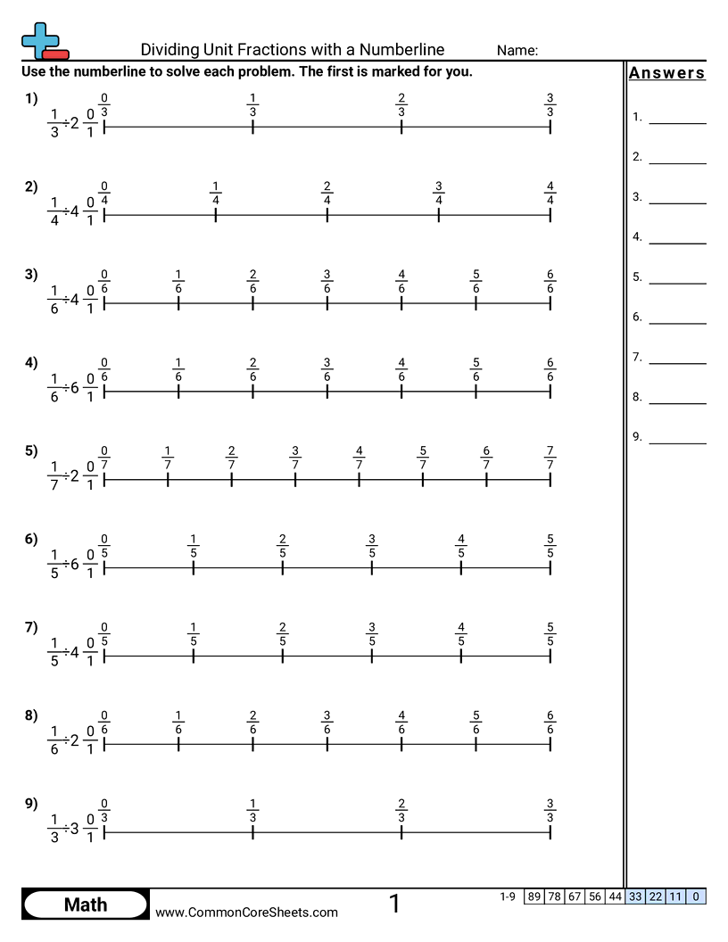 Each worksheet has 9 problems dividing a unit fraction by a whole number using a numberline.