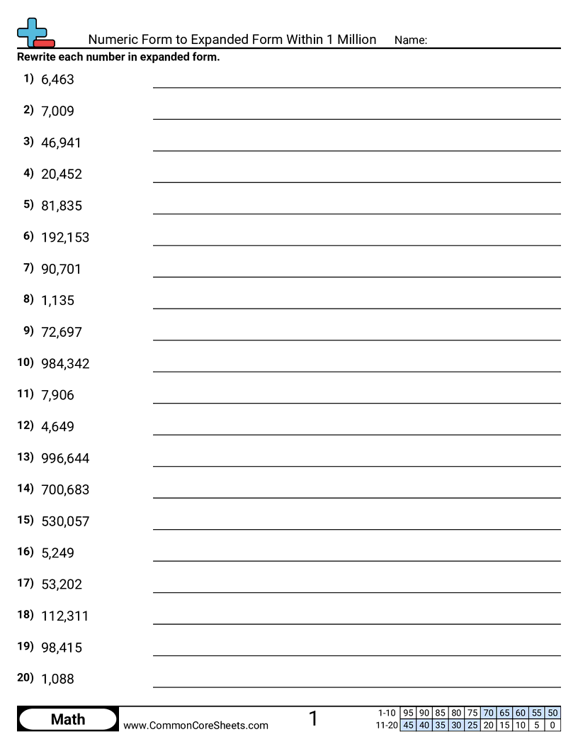 Each worksheet has 20 problems converting from numeric form to expanded form.