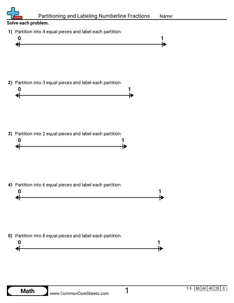Each worksheet has 5 problems partitioning and then labeling a numberline.