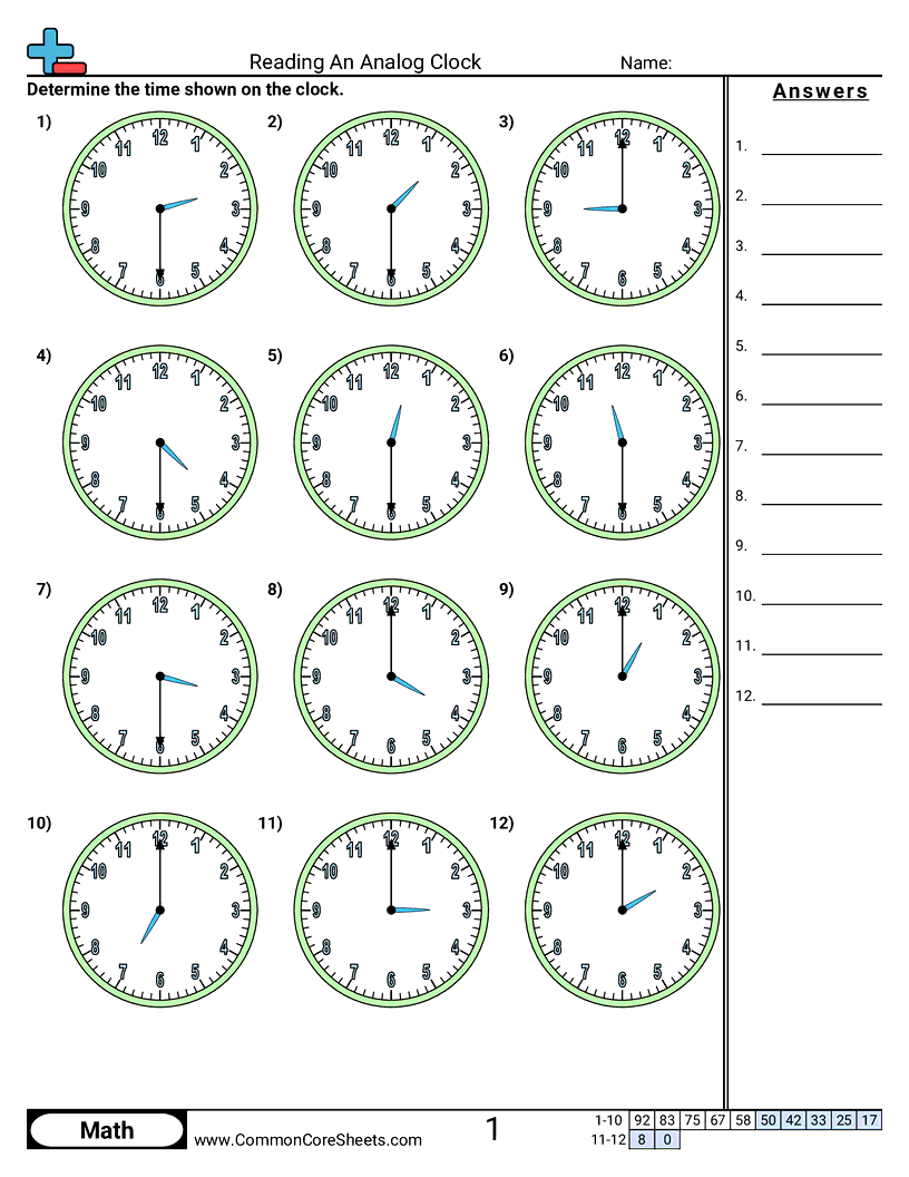 Each workshet has 12 problems reading a clock. All problems are in half hour increments (ie. 4:30, 6:00, 8:30).