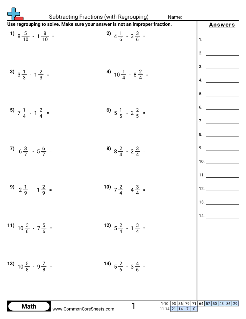 Subtracting Fractions (with Regrouping) Worksheet Download