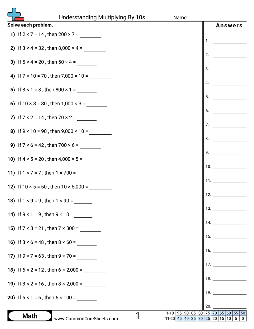 Each worksheet has 20 problems multiplying a single digit number by a multiple of 10, 100 or 1,000.