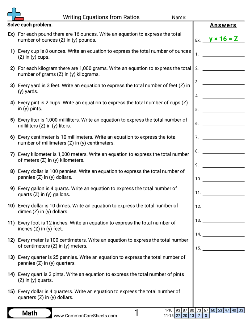 Each worksheet has 15 problems expressing a measurement ratio as an equation.